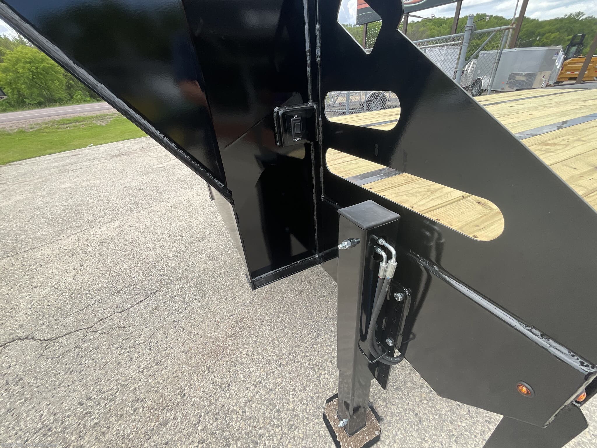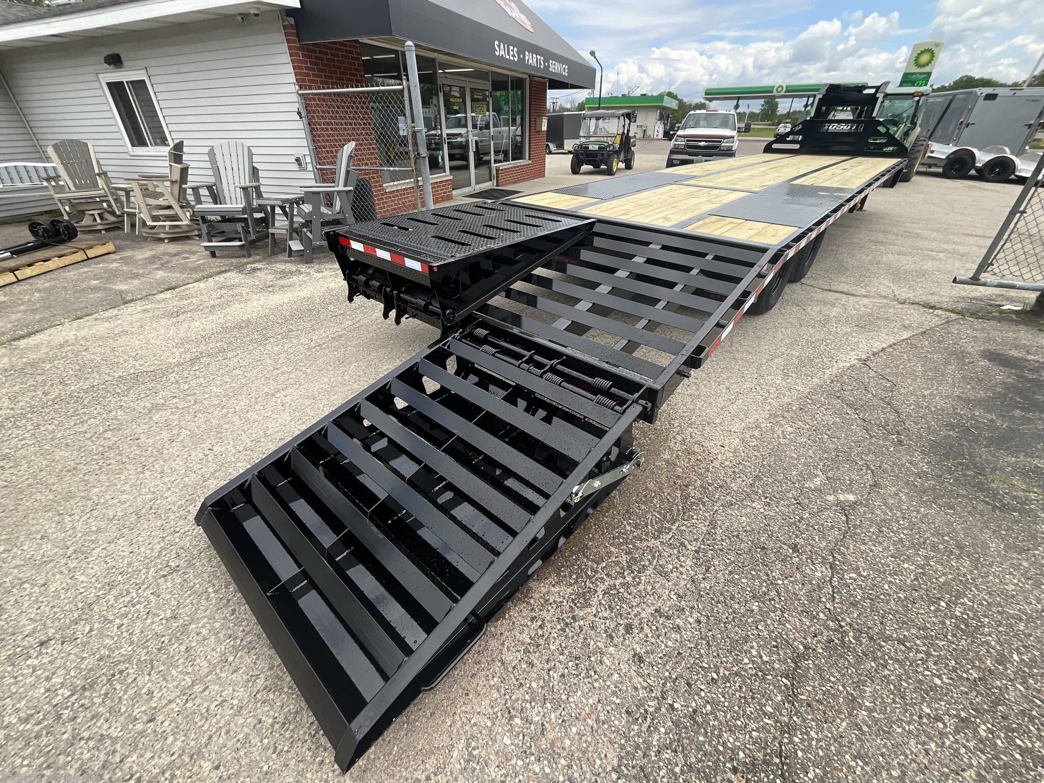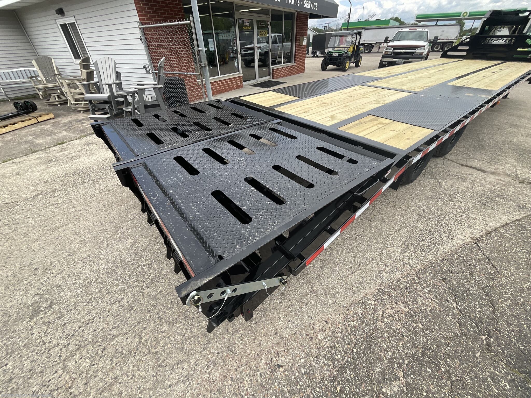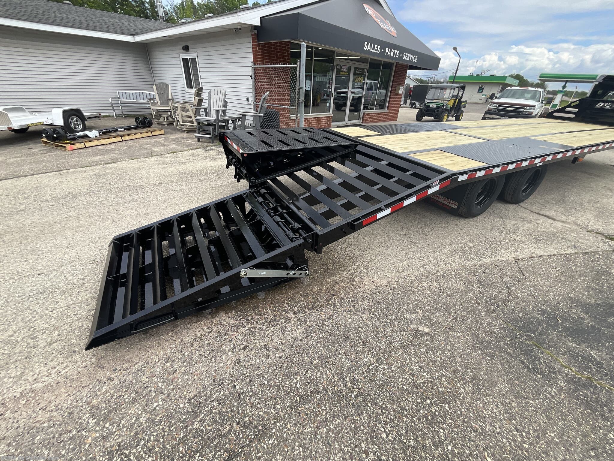 This rugged trailer emphasizes heavy-duty performance with a gross vehicle weight rating of 25,900 pounds, making it suitable for transporting large or multiple loads. The dual hydraulic tongue jacks add stability during loading and unloading, while the twin jump ramps, each 4 feet wide and fold-over, facilitate easy loading and unloading of equipment or vehicles. The trailer's wide 102-inch construction provides ample space for various cargo types, ensuring flexibility for different applications.