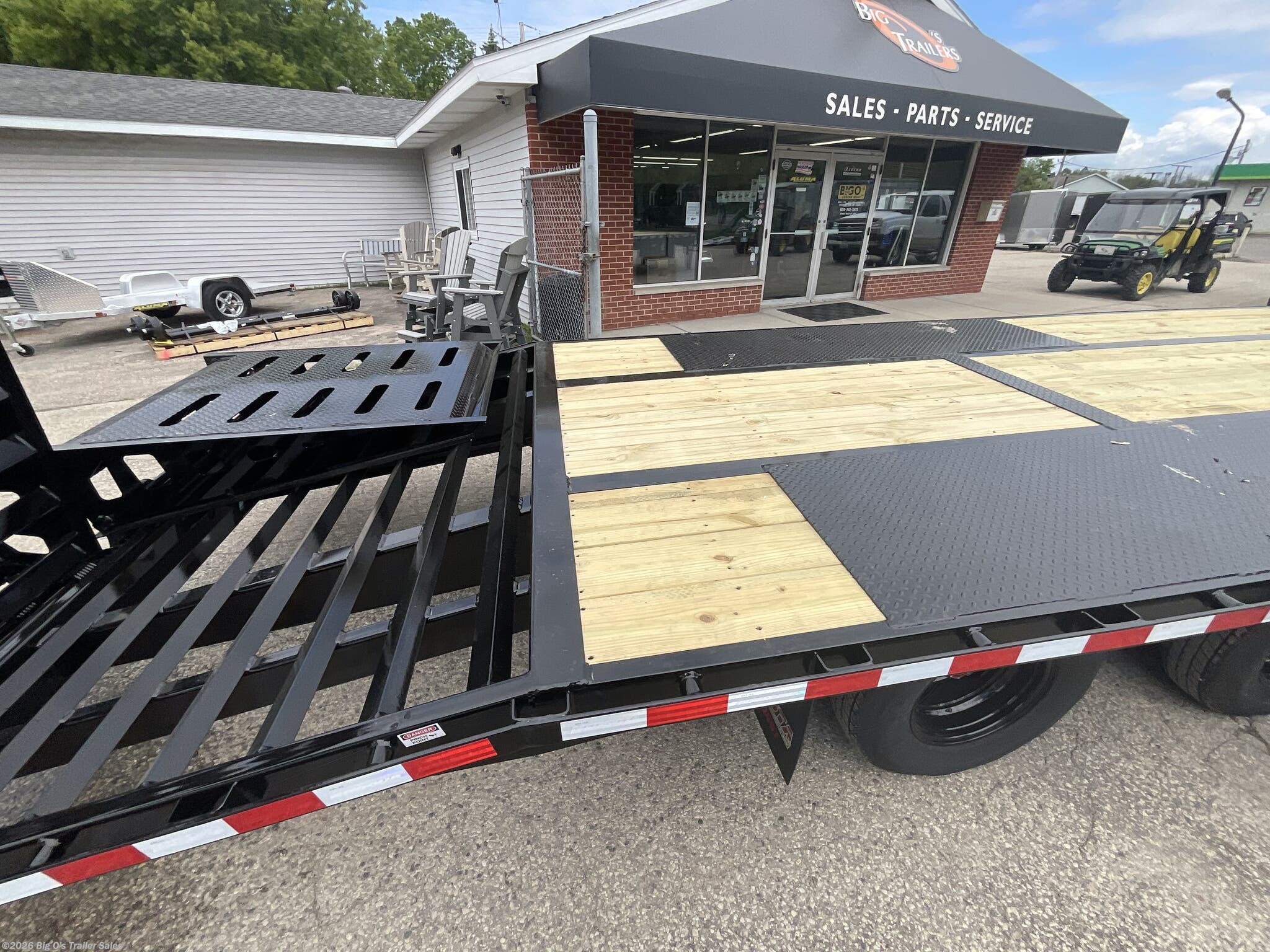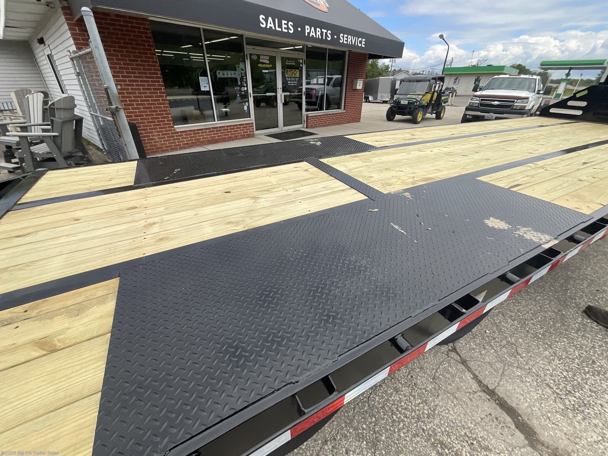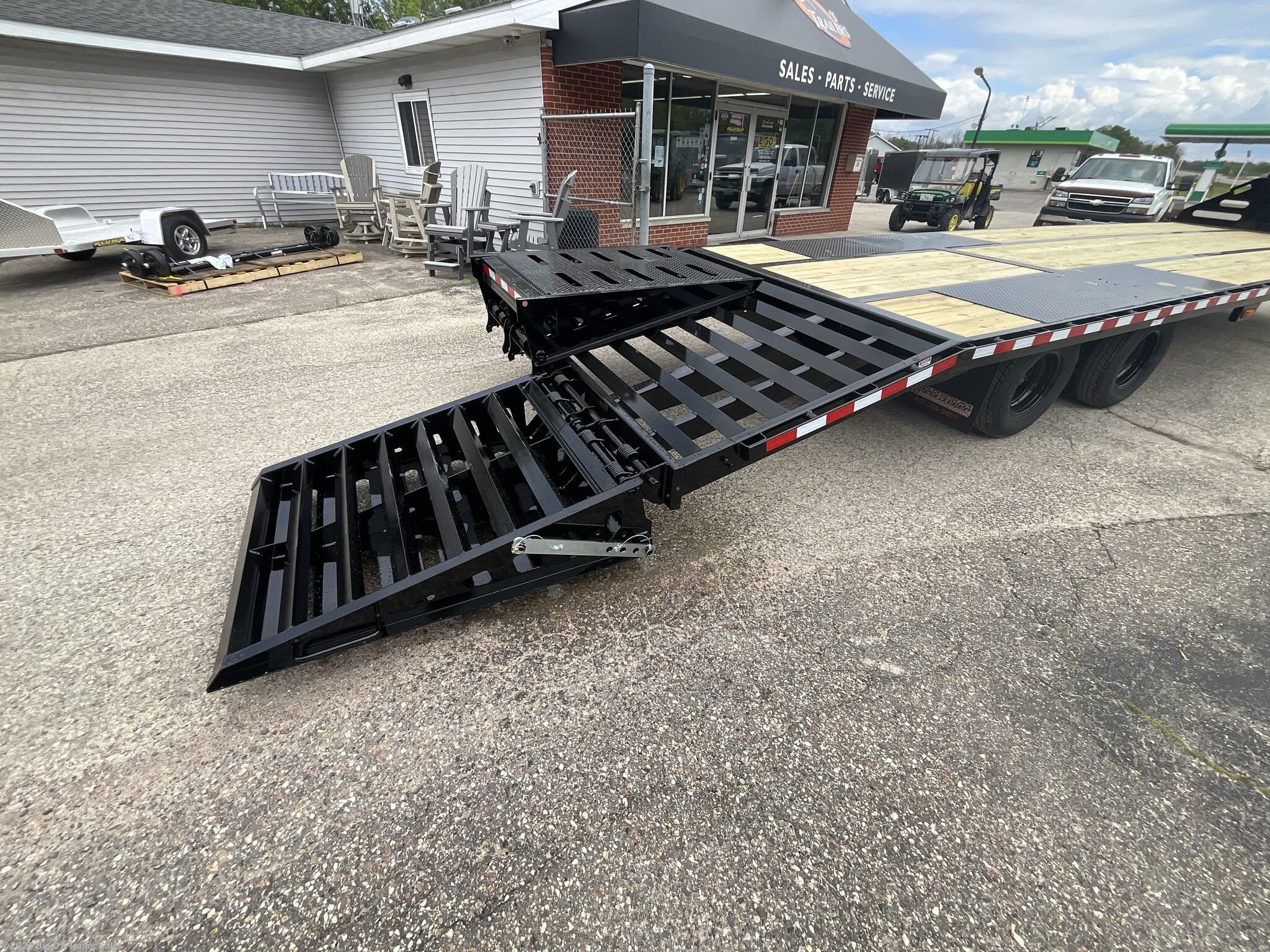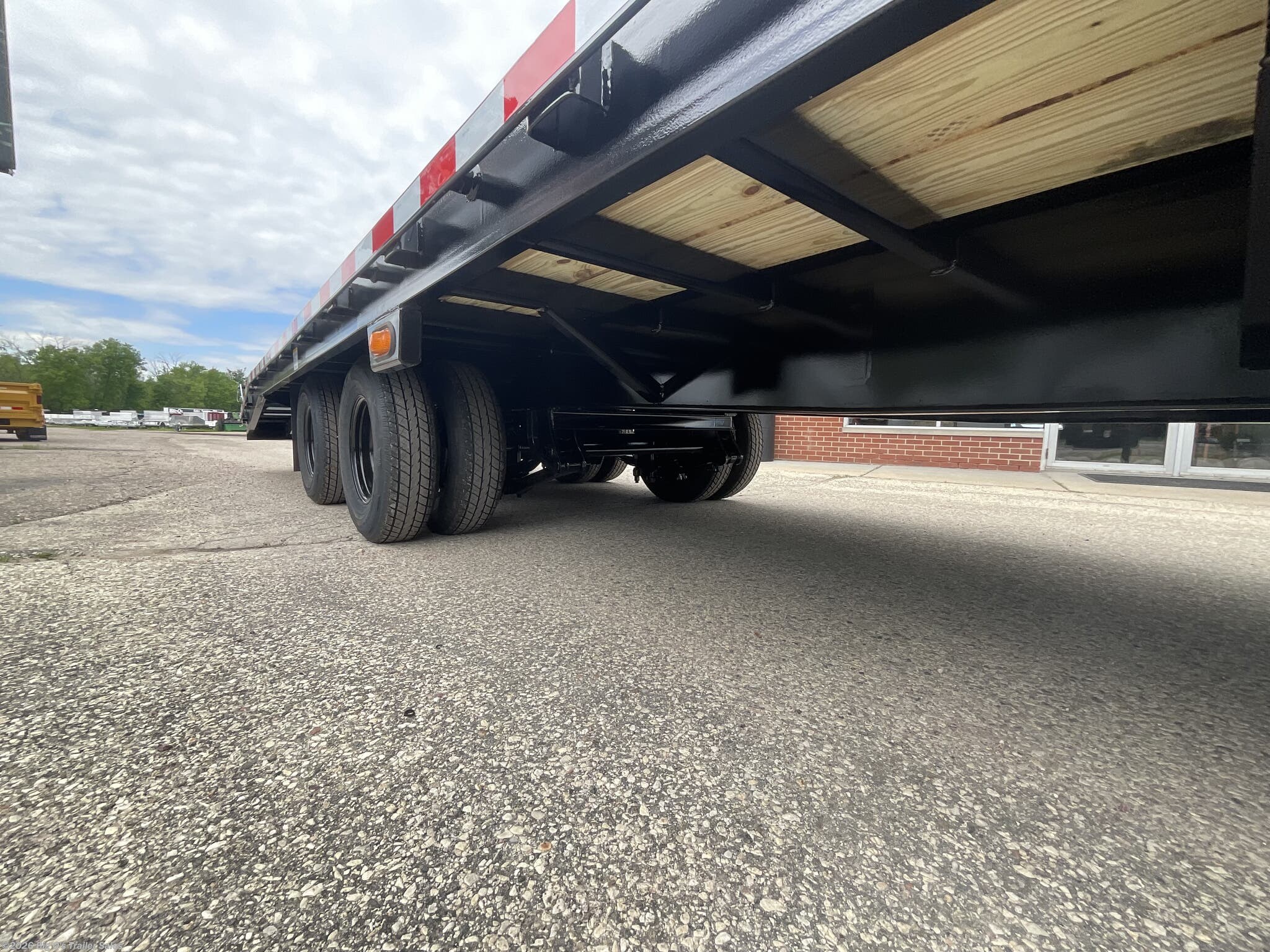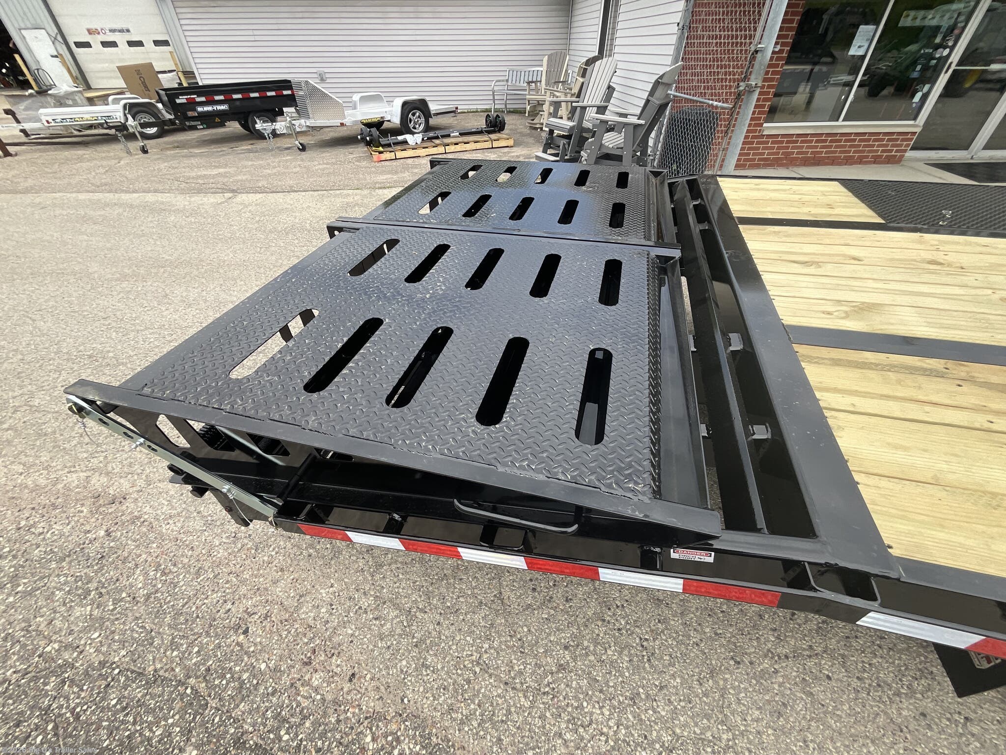 This rugged trailer emphasizes heavy-duty performance with a gross vehicle weight rating of 25,900 pounds, making it suitable for transporting large or multiple loads. The dual hydraulic tongue jacks add stability during loading and unloading, while the twin jump ramps, each 4 feet wide and fold-over, facilitate easy loading and unloading of equipment or vehicles. The trailer's wide 102-inch construction provides ample space for various cargo types, ensuring flexibility for different applications.