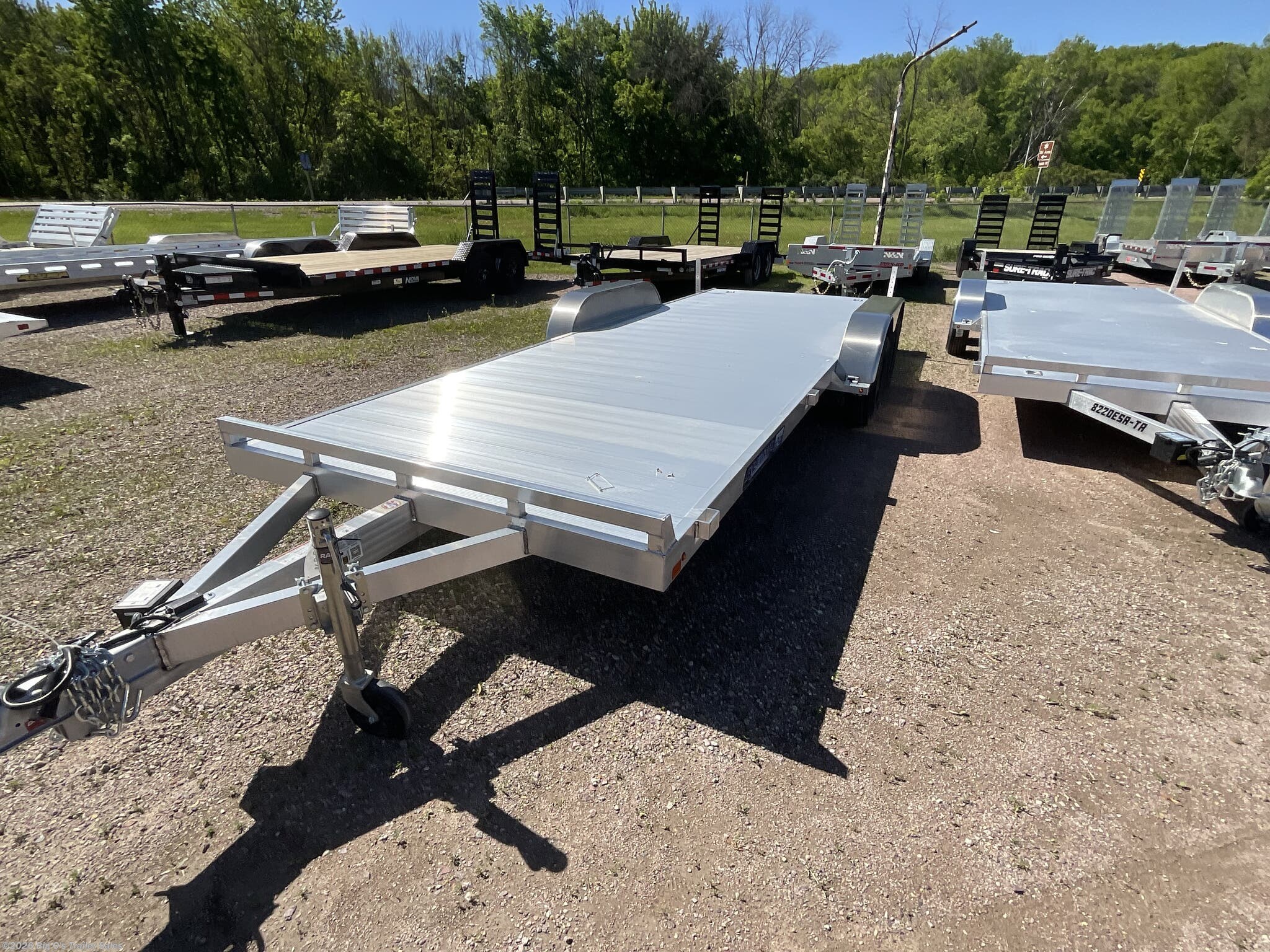 Built with a robust 20-foot length and a sturdy frame, this utility trailer provides ample space for transporting various loads. The extruded floor offers enhanced durability and ease of maintenance, ensuring long-lasting performance. The trailer is equipped with dual 3500-pound rubber torsion axles featuring electric brakes, providing smooth and controlled stopping power for added safety during transport. The tires are sized at ST205/75R14, mounted on black steel wheels with a 5-4.5 bolt pattern, combining strength with a sleek appearance.