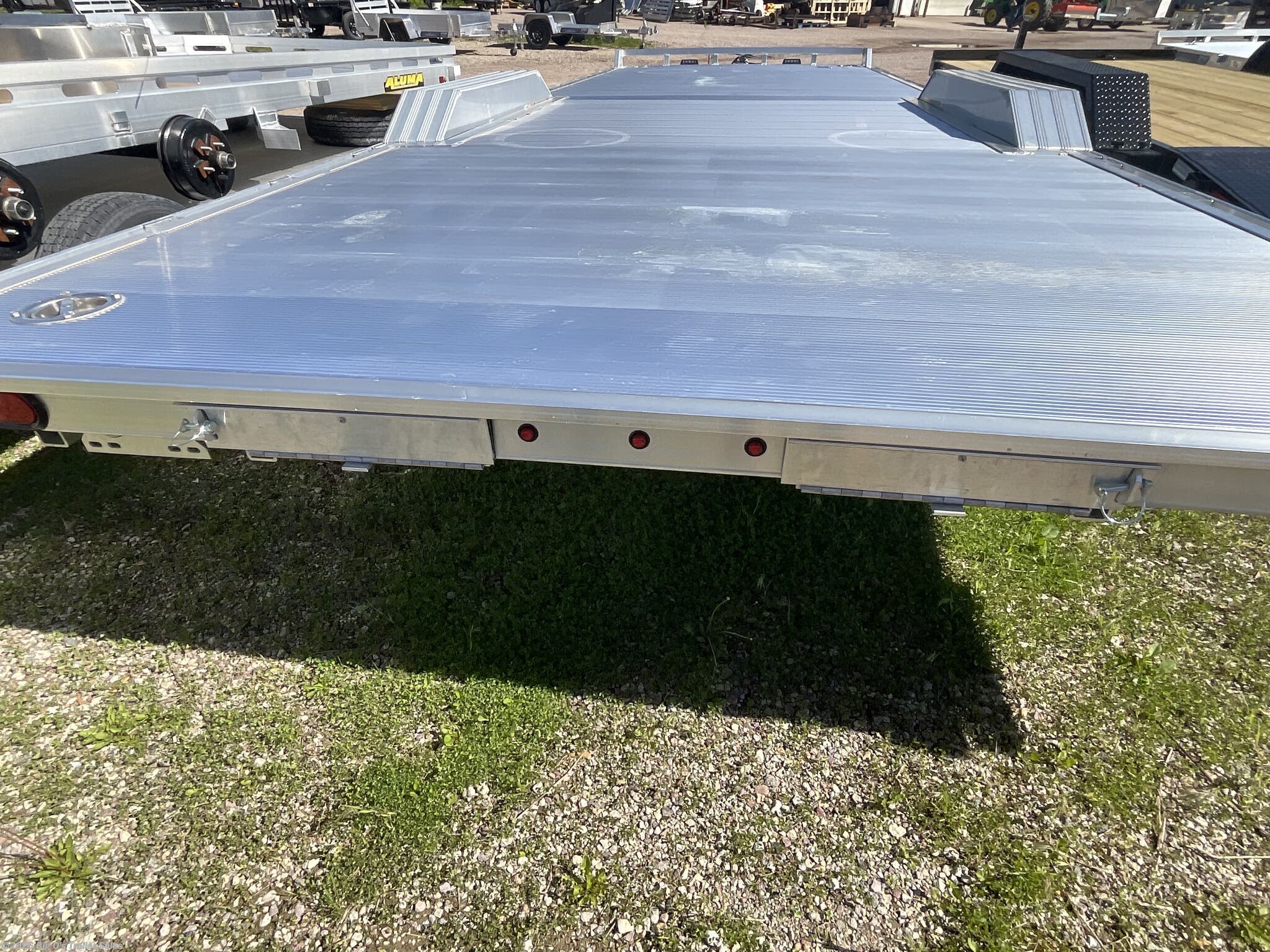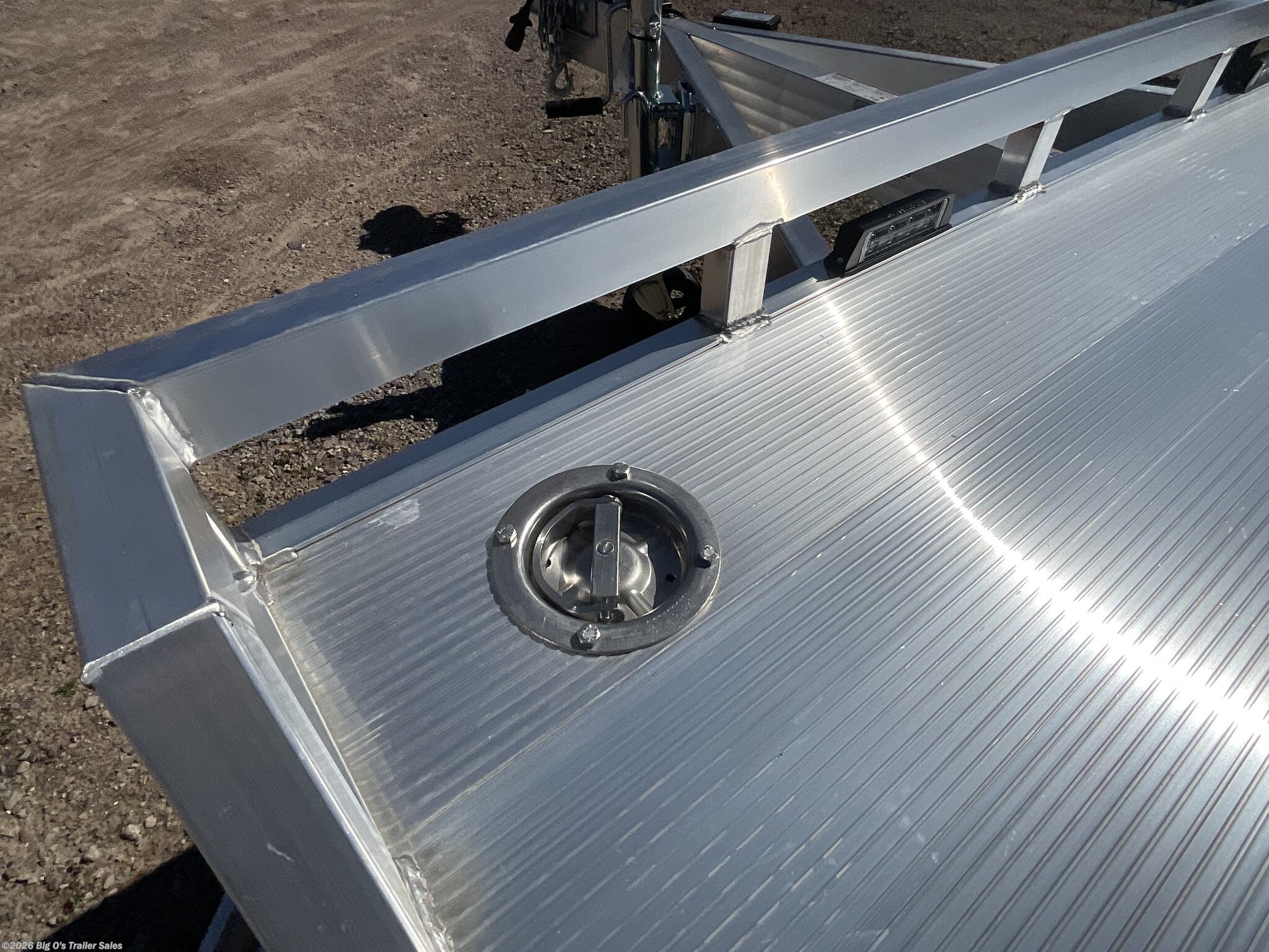 Measuring 8 feet wide and approximately 24 feet long, this in-stock model offers ample space for your hauling requirements. Its sleek exterior is finished in a corrosion-resistant aluminum that not only provides an eye-catching look but also ensures long-lasting durability. The trailer's construction features an extruded aluminum floor, which delivers exceptional strength and resilience under heavy loads. Additionally, the drive-over aluminum fenders simplify loading and unloading processes.