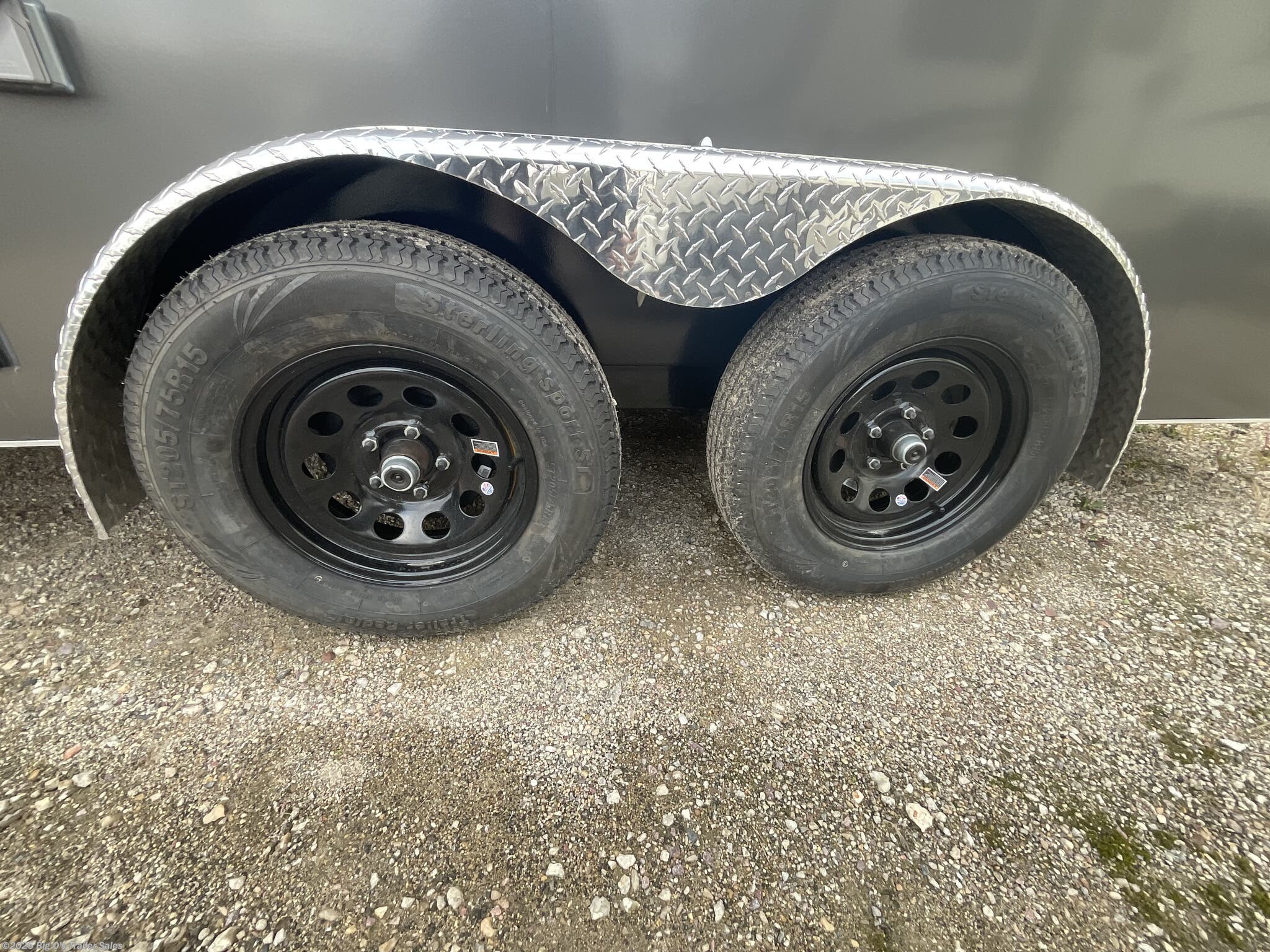 2026 STEEL V-NOSE 7.5X18STVTA35 CHARCOAL G345 +6" HEIGHT3500# 5BOLT TORSION BRAKE AXLE ST205 75R15 STEEL BLACK RIMS REAR SPOILER W/TWO 9" LED LOADING LIGHTS W 12V SWITCH 2 5/16 COUPLER 2000# JACK WITH DROP LEG FOOT 7 WAY PLUG REAR RAMP WITH STD FLAP SIDE DOOR 6-5000# DRINGS INSTALLED 2-8" LED DOME LIGHTS W 12V SWITCH 110V BRONZE PACKAGE
