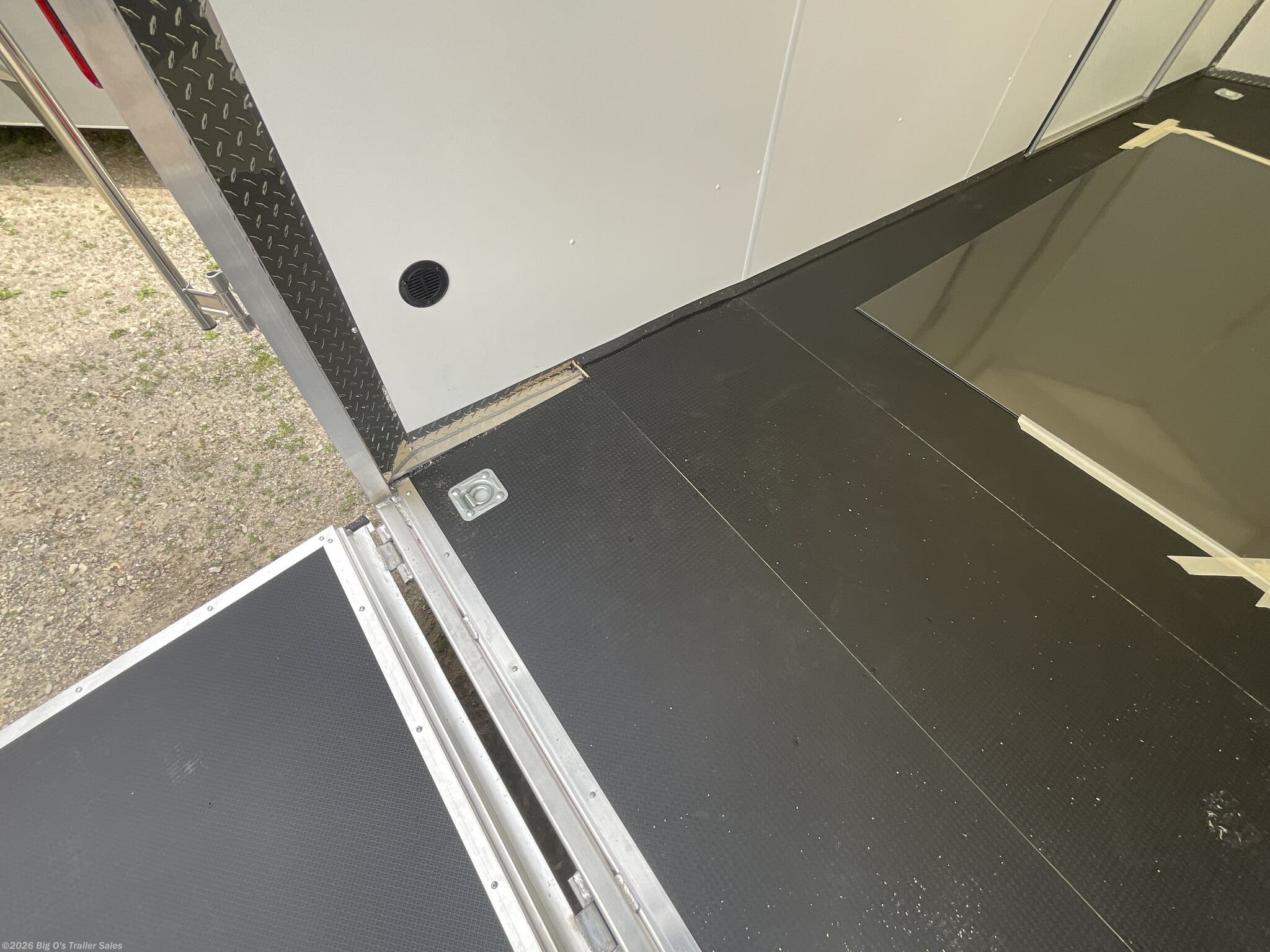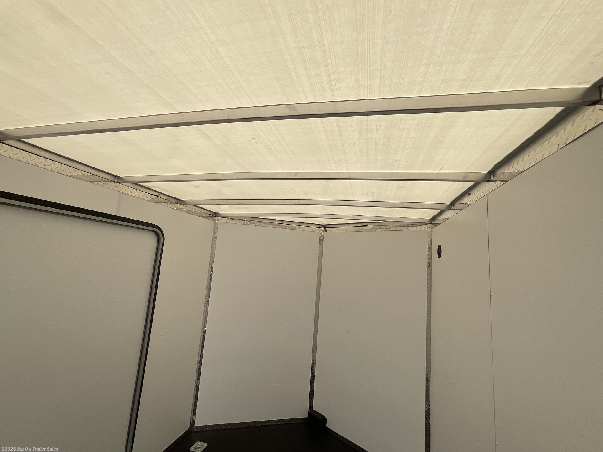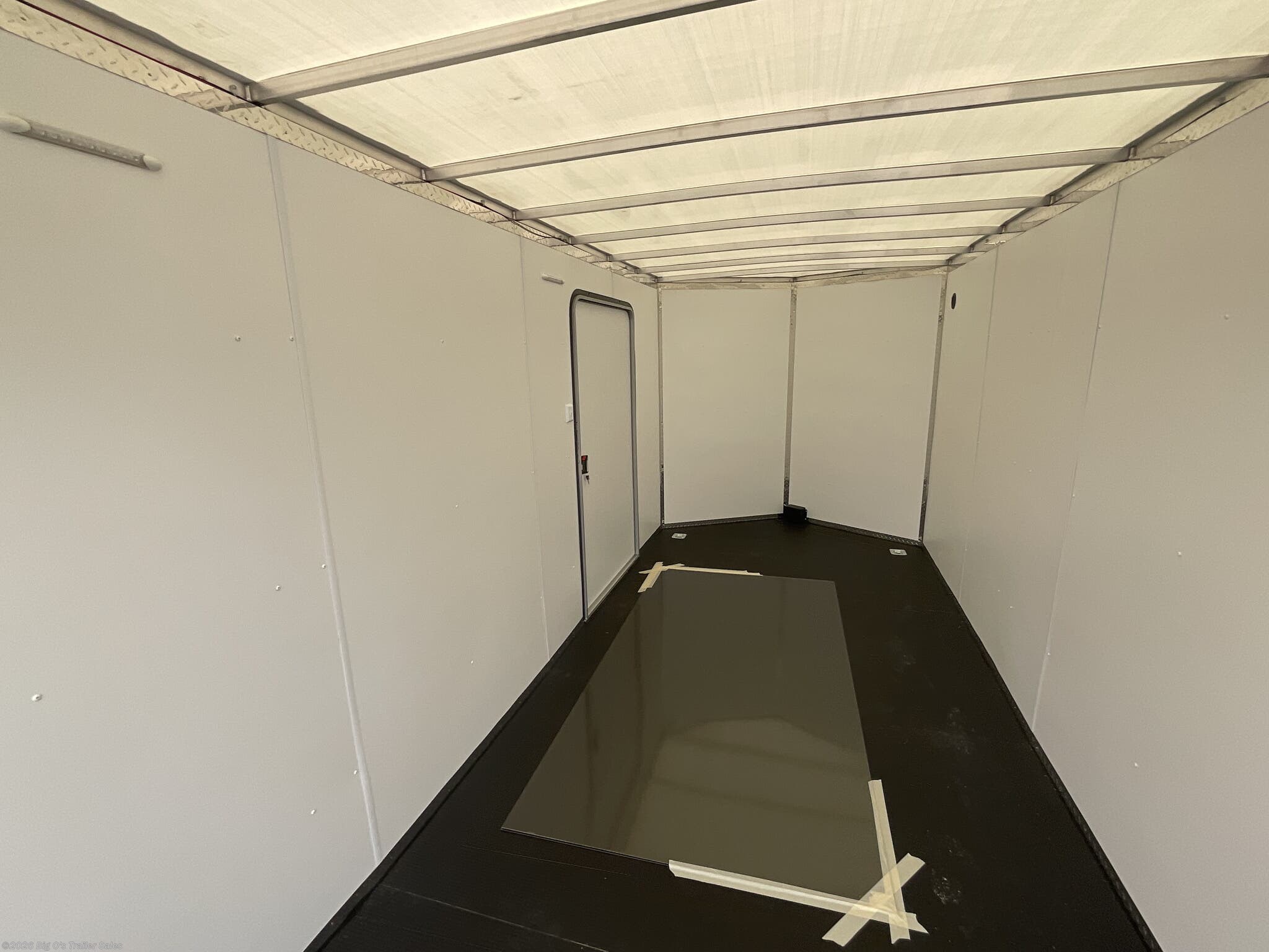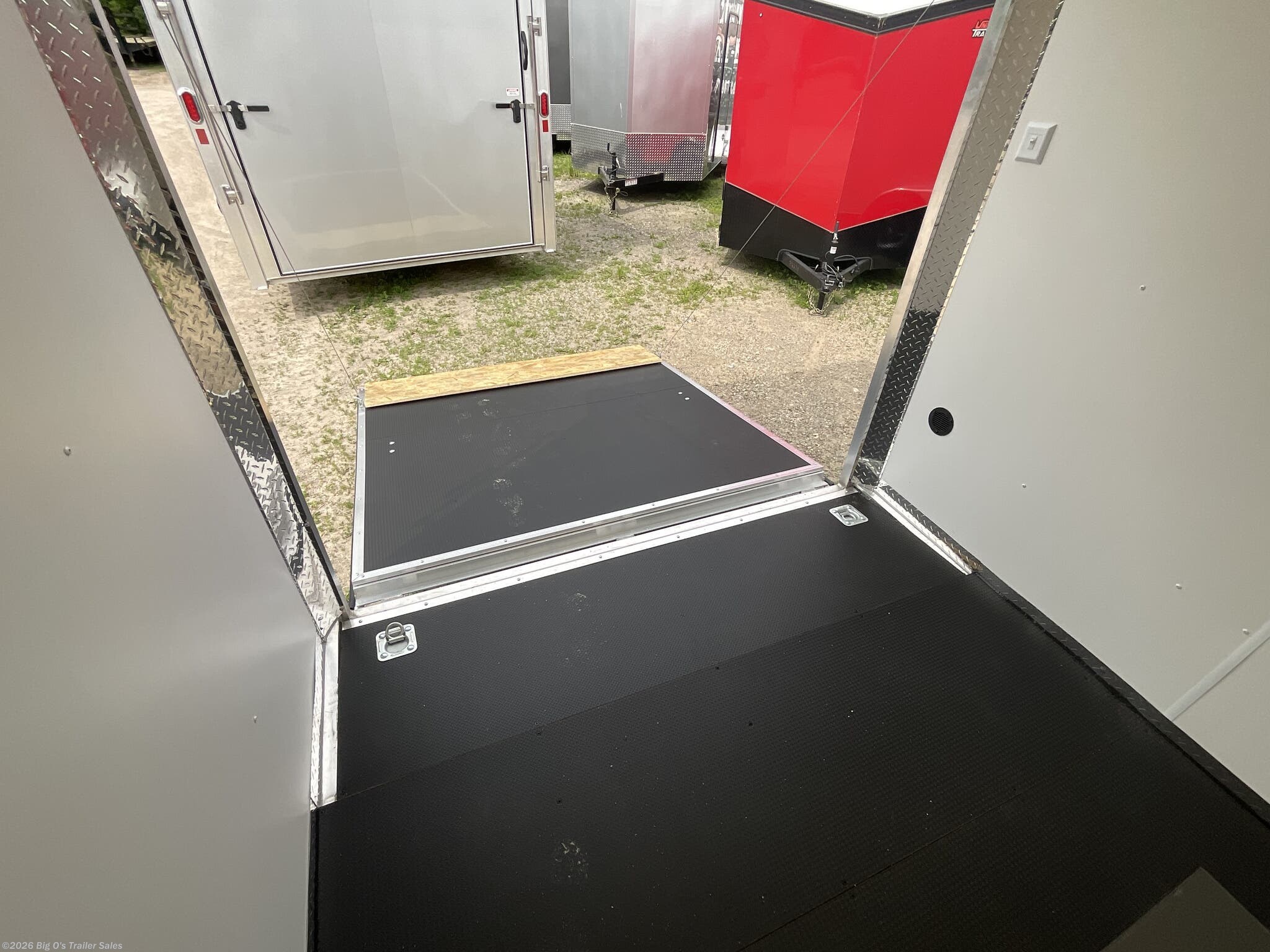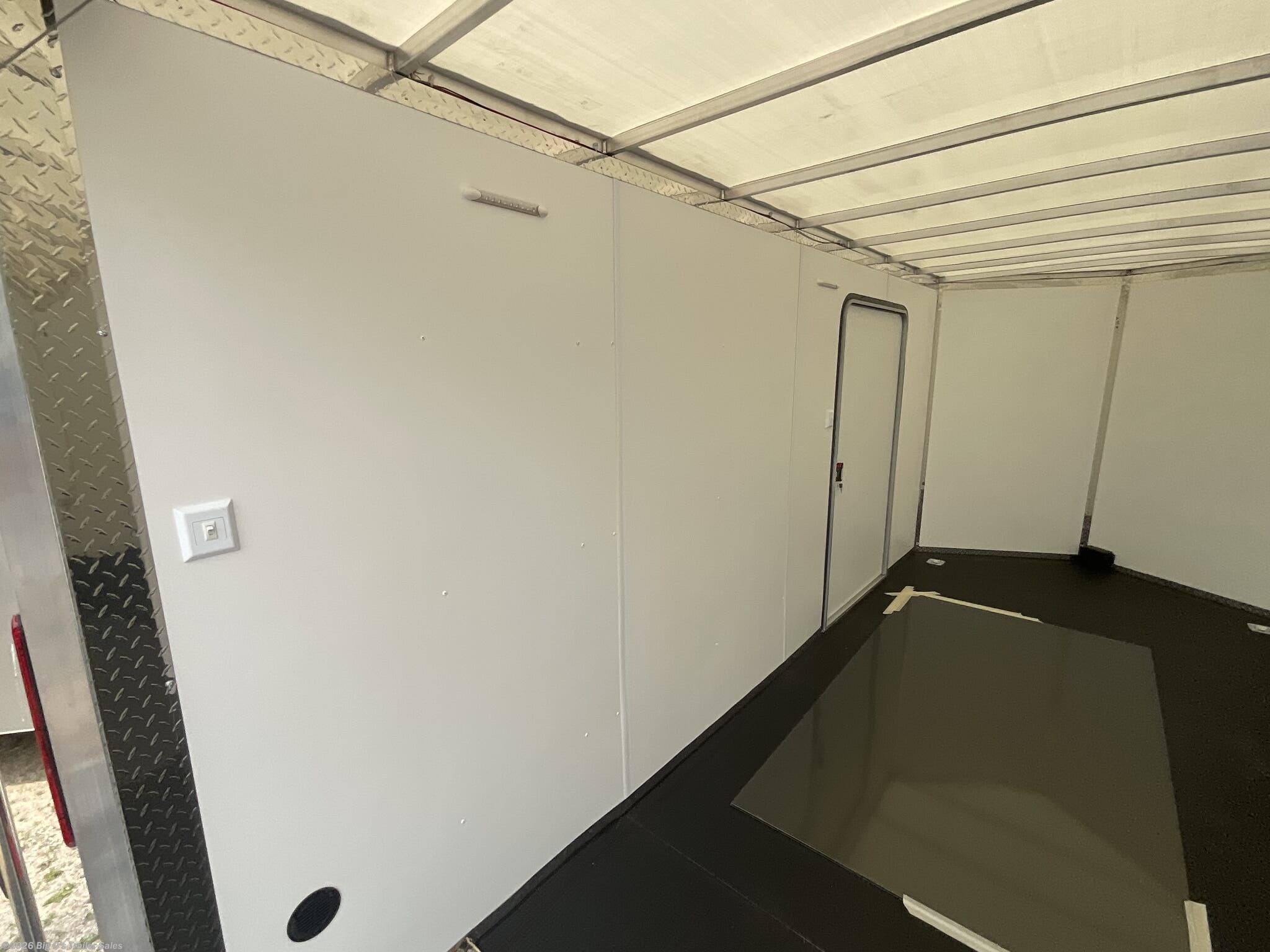 This in-stock 2026 model showcases a sleek Silver Frost exterior, enhancing its modern appearance and allowing it to stand out on any lot or road. The trailer features a translucent roof, providing natural light inside, and a rear spoiler equipped with two 9-inch LED loading lights for improved visibility during loading and unloading. The rear ramp door with superstratum flooring ensures smooth and easy access for possessions or equipment, making loading effortless. The trailer is equipped with a 2 5/16-inch coupler and a 7-way light connector for easy towing compatibility.